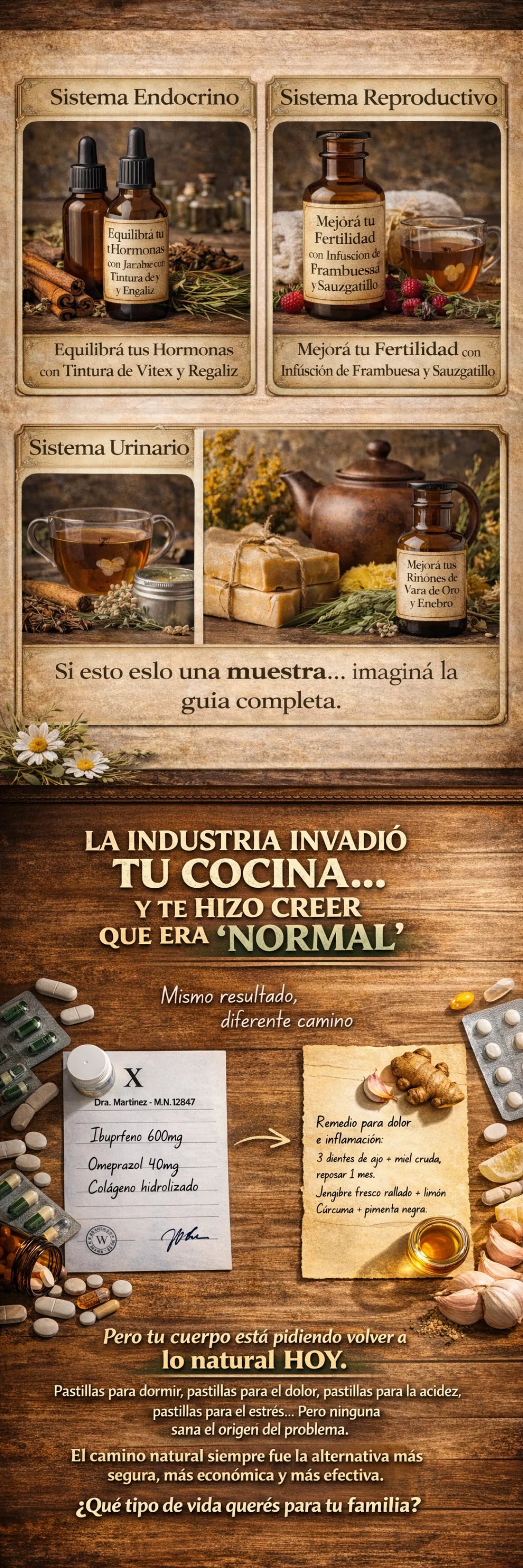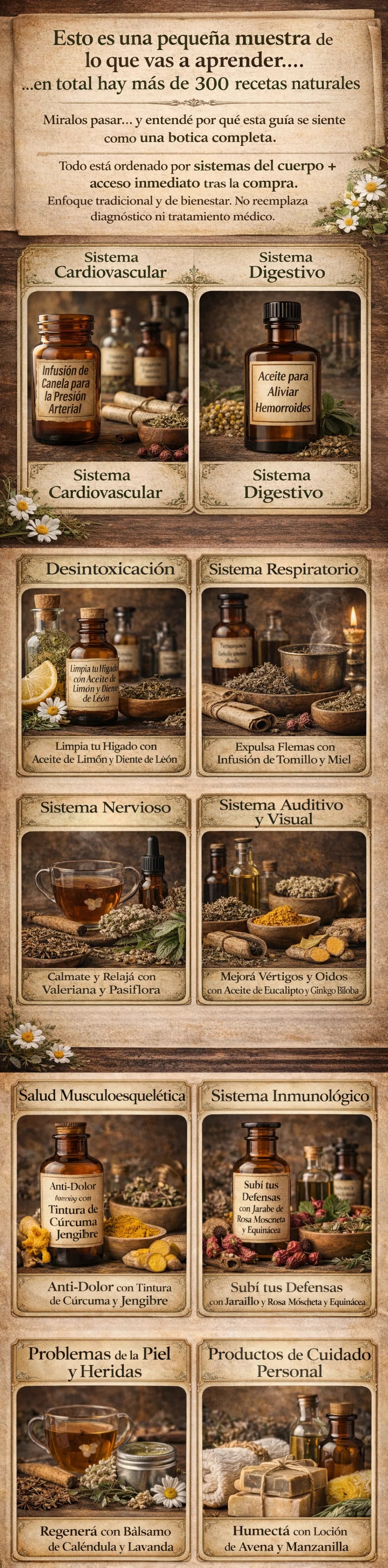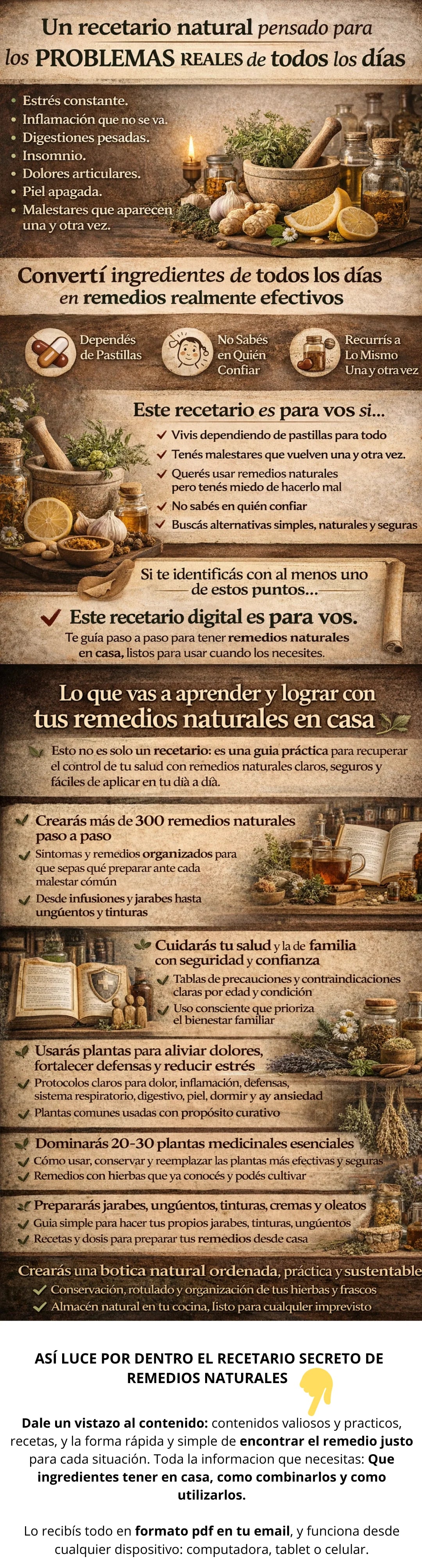 Cada receta incluye cantidades exactas, tiempos y pasos claros. No necesitás conocimientos de fitoterapia.