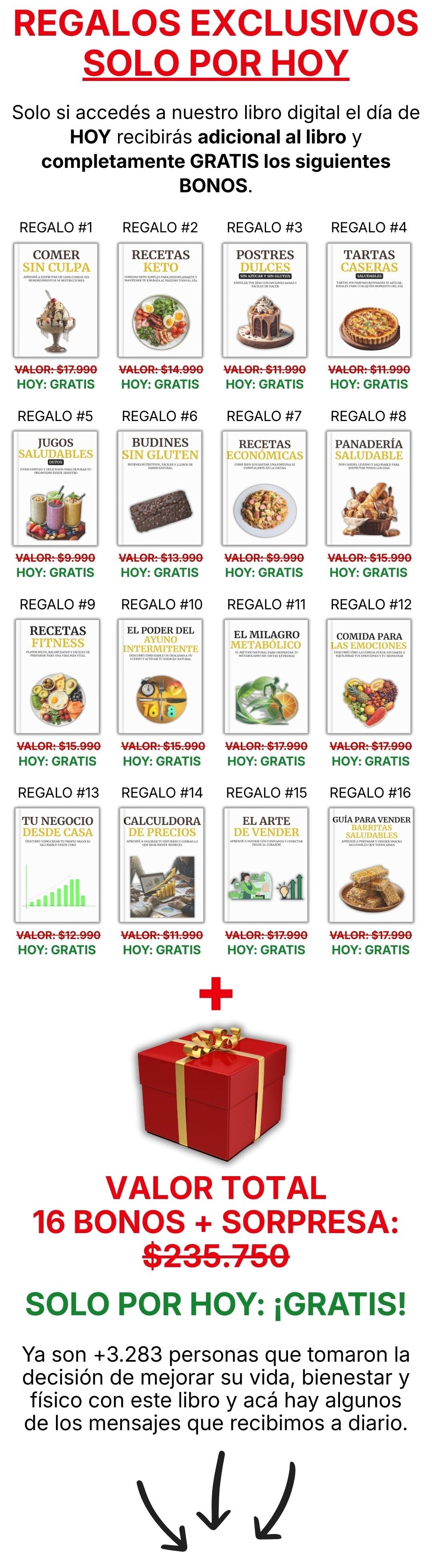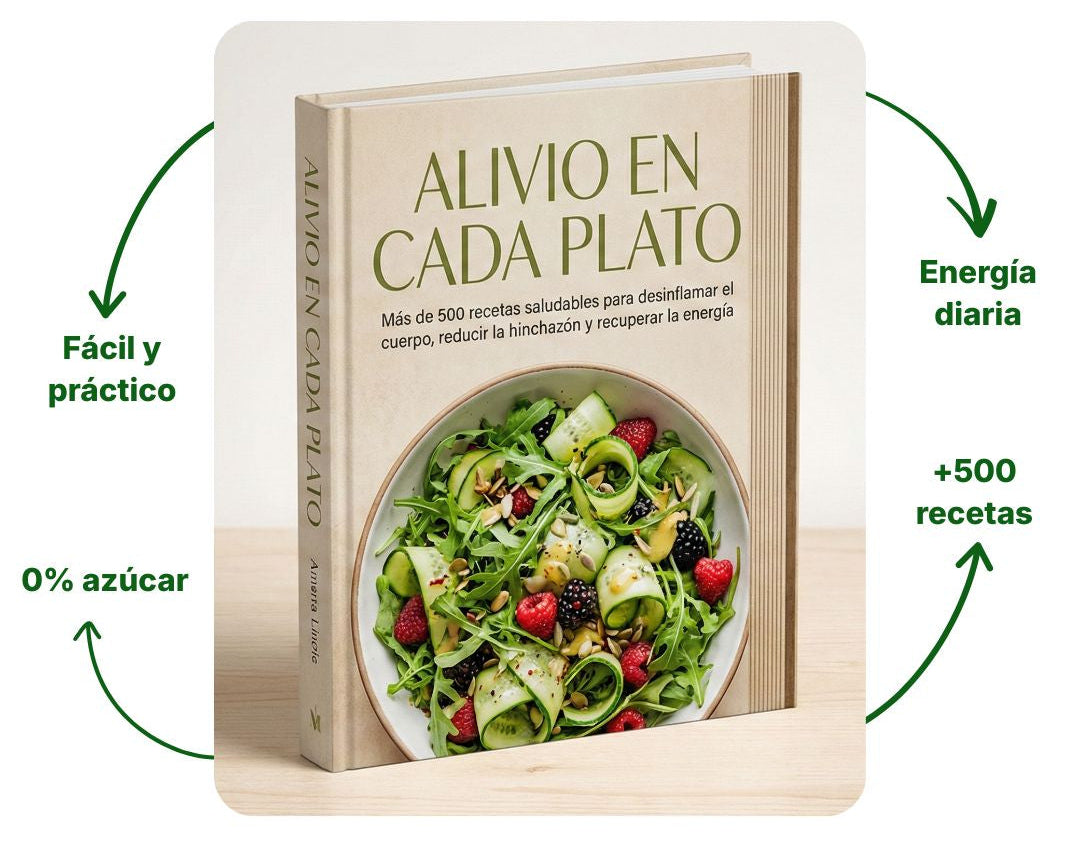 Vas a recibir el libro digital Alivio en Cada Plato, con más de 500 recetas saludables, además de 16 bonos digitales exclusivos, todo en formato PDF, listo para usar.