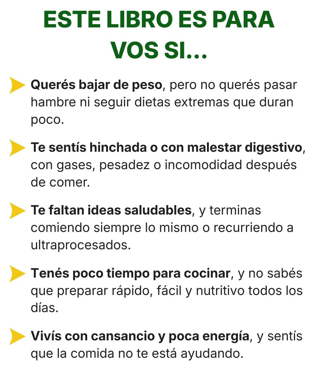 No. El enfoque del libro es ayudarte a comer mejor sin dietas extremas, sin pasar hambre y sin eliminar comidas de forma radical.